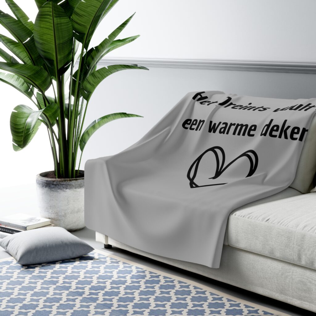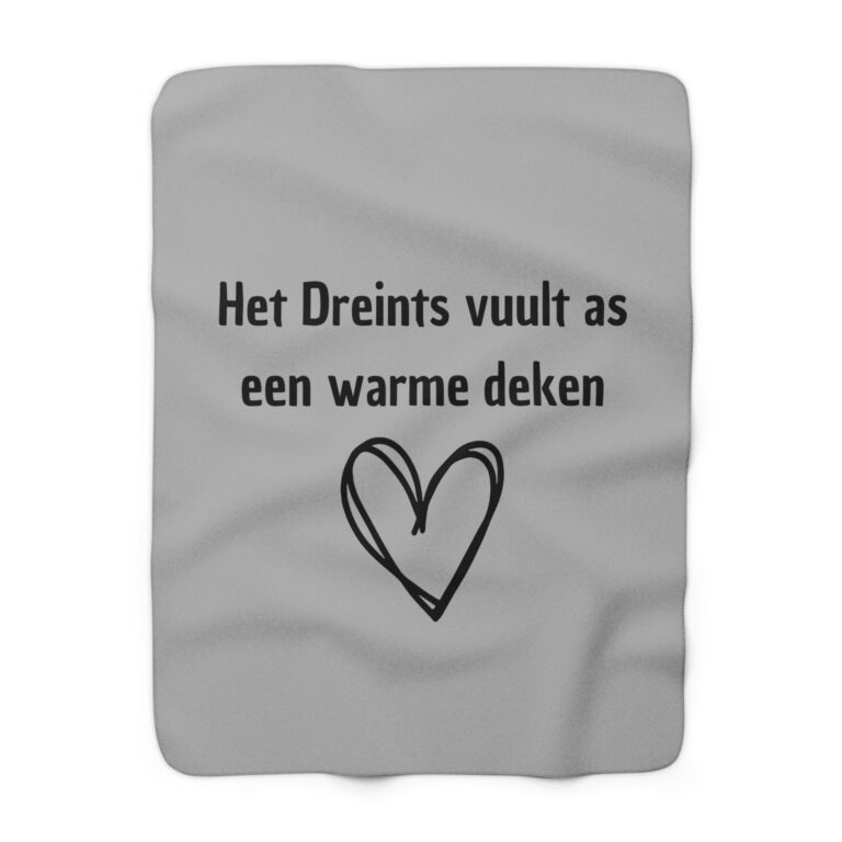 De dikke, goeie kwaliteit fleece is an ien kaant bedrukt met de tekst ‘Het Dreints vuult as een warme deken’. De achterkaant is heerlijk zacht Sherpa en vuult as een warme knuffel.