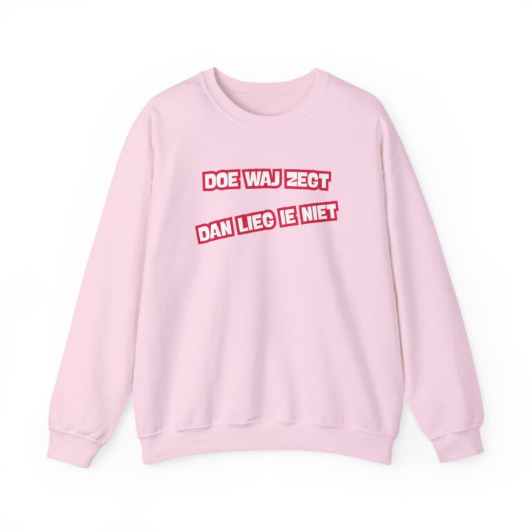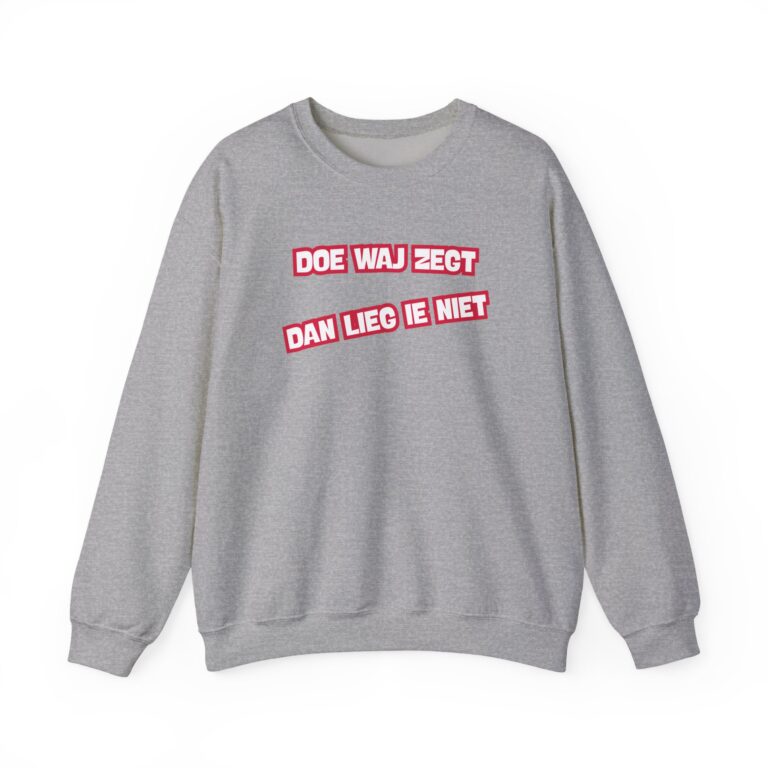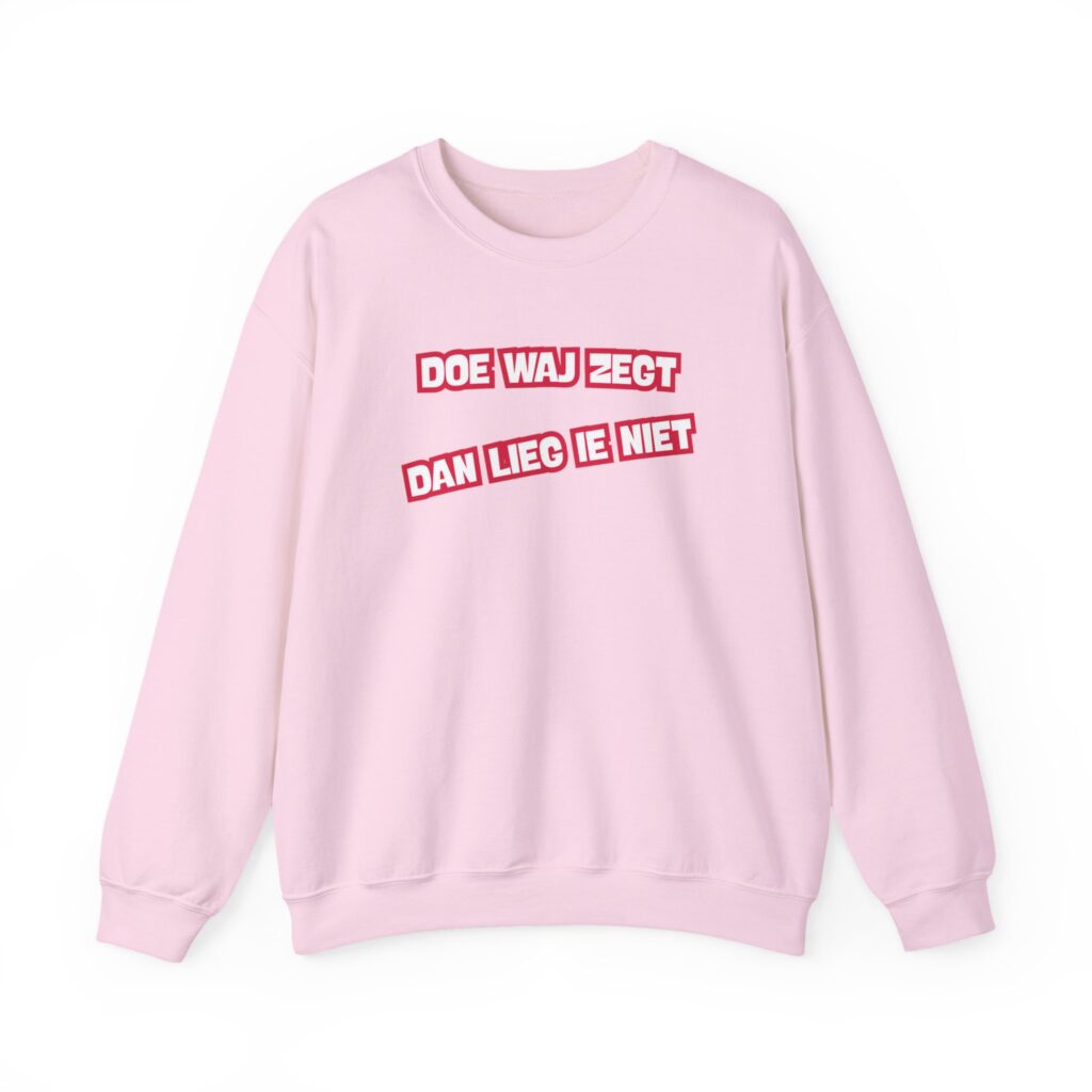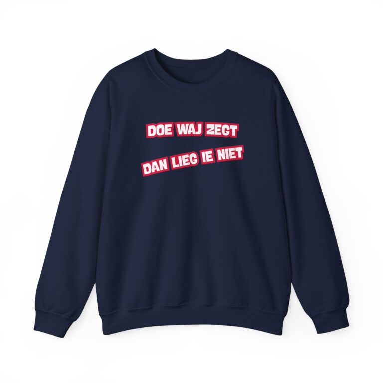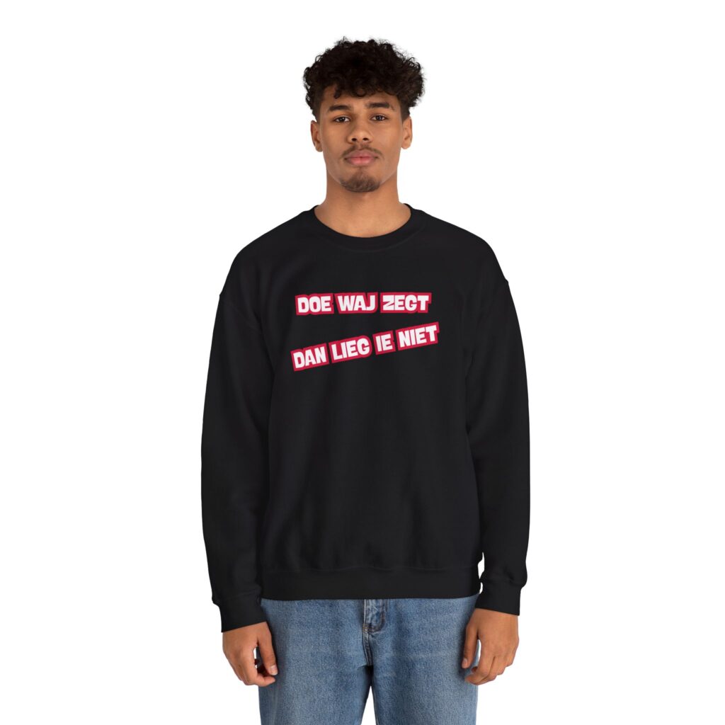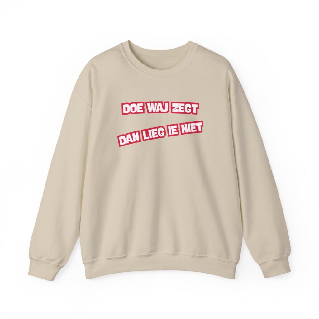Dizze lekkere trui hef de opdruk ‘Doe waj zegt, dan lieg ie niet’. En da’s niet zomaor: dizze kreet was ien van de kreten die in december 2025 inzunden weur um met te dingen naor de ‘Mooiste Drentse kreet van 2025’. Het is een mooie bosschup um met te geven; der is volk zat dat hier nog wat van leren kan.
