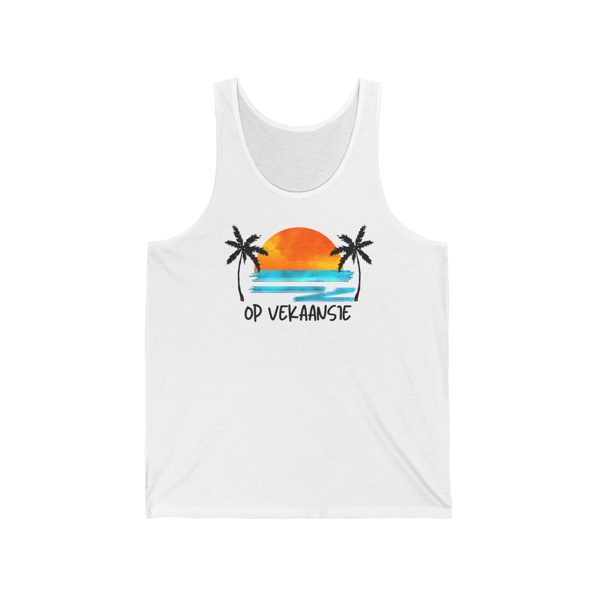 Dizze tank top (of zuw gewoon hempie zeggen?) hef wat extra ruumte under de arms um knellen te veurkommen. Want aj ‘op vekaansie’ bint, dan woj je vanzölf vrij vulen. Aj dit hemd in de kast hangen hebt, kriej al een vekaansiegevuul!