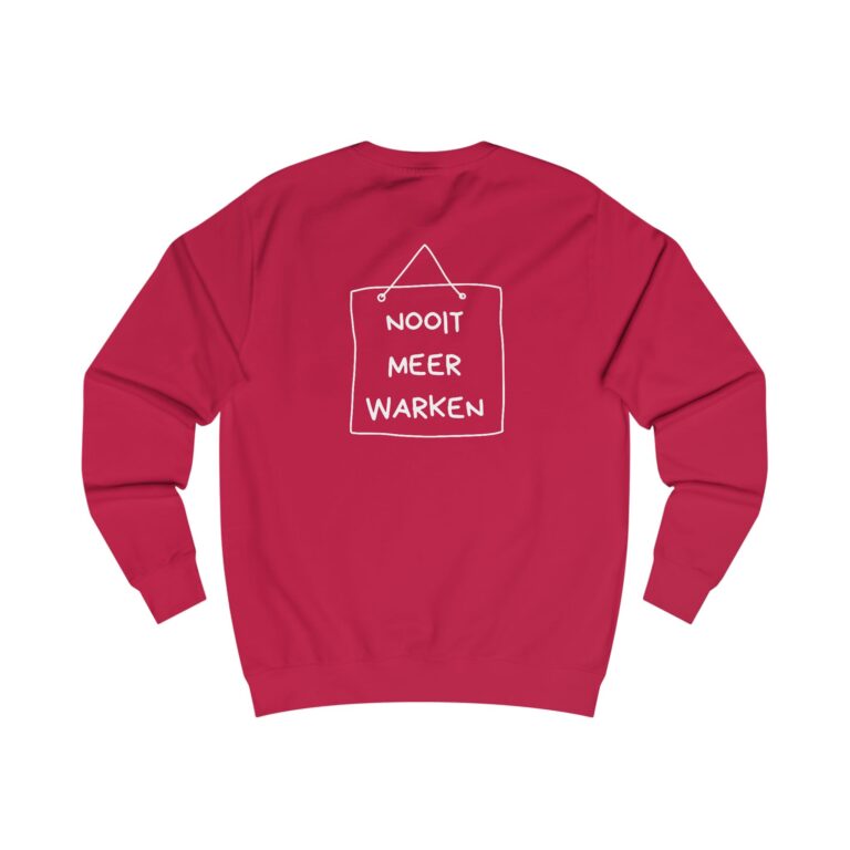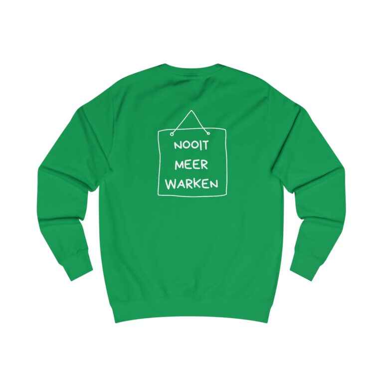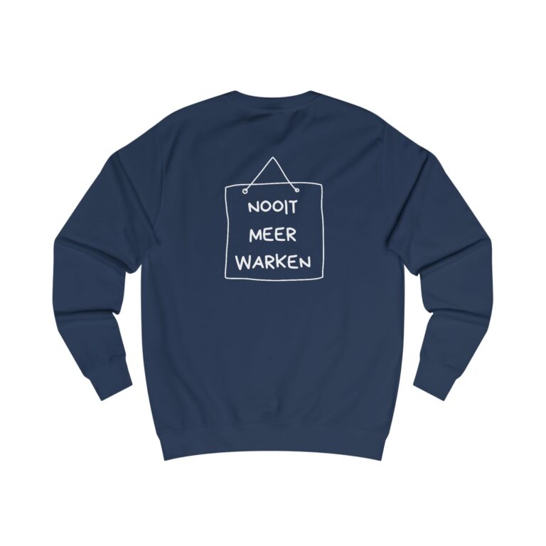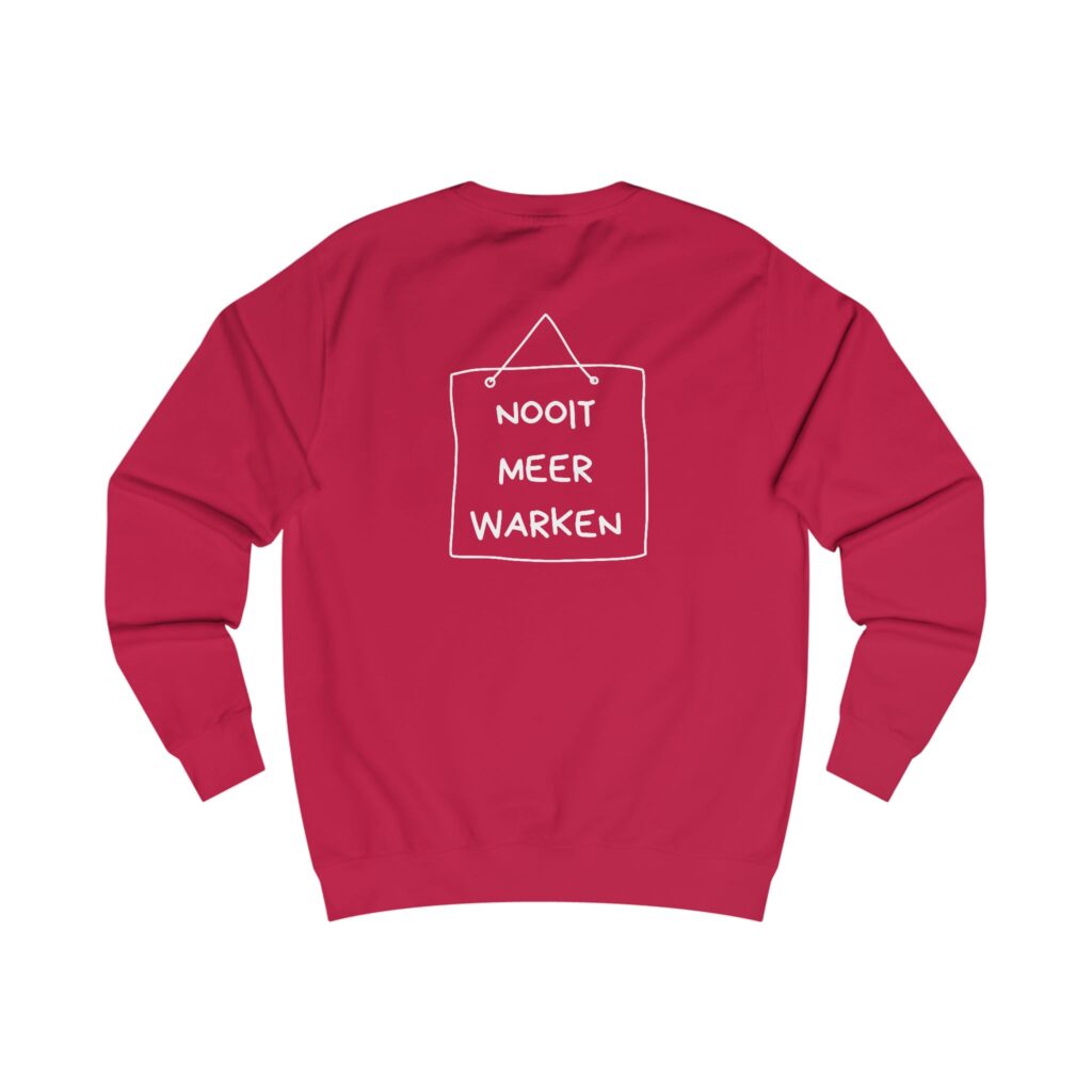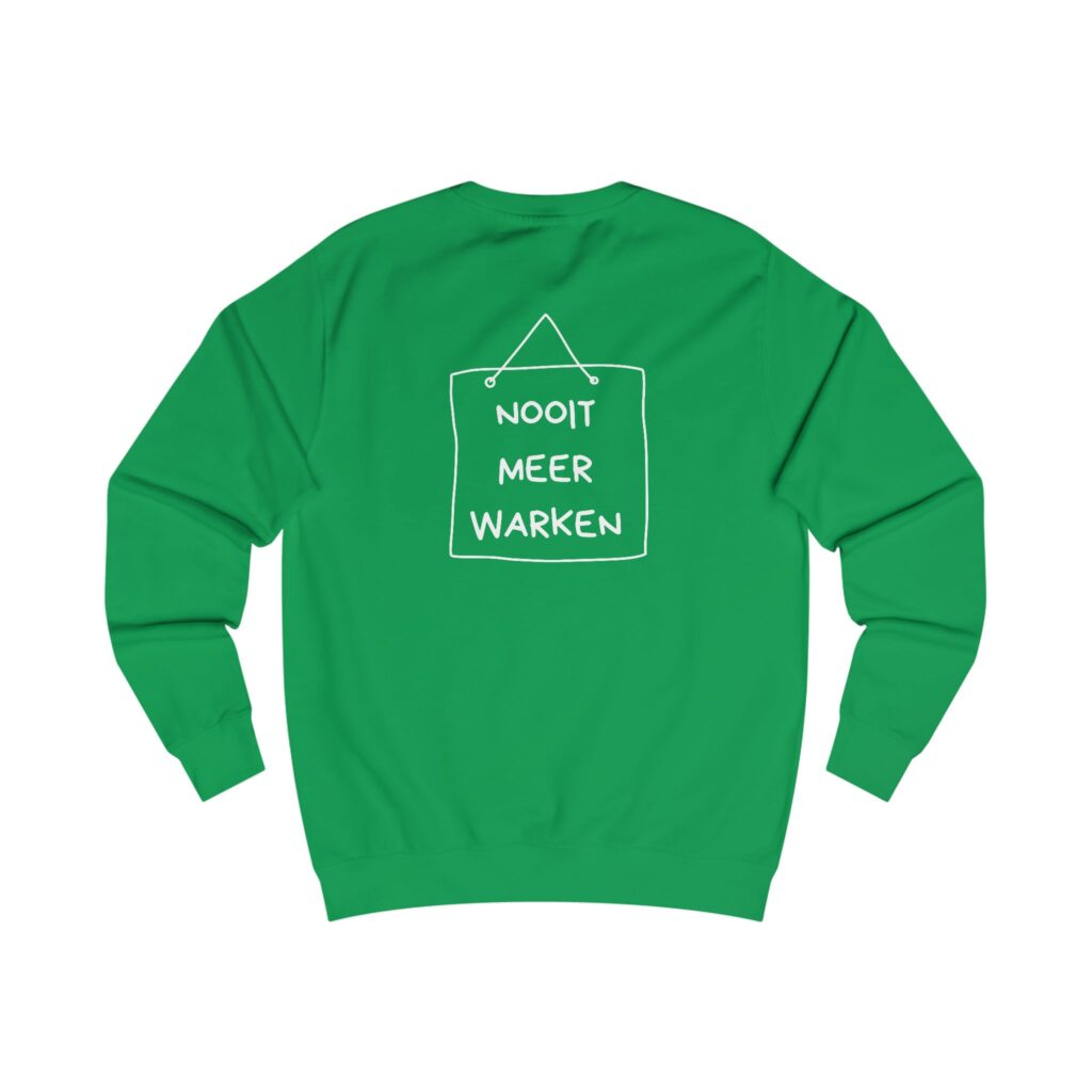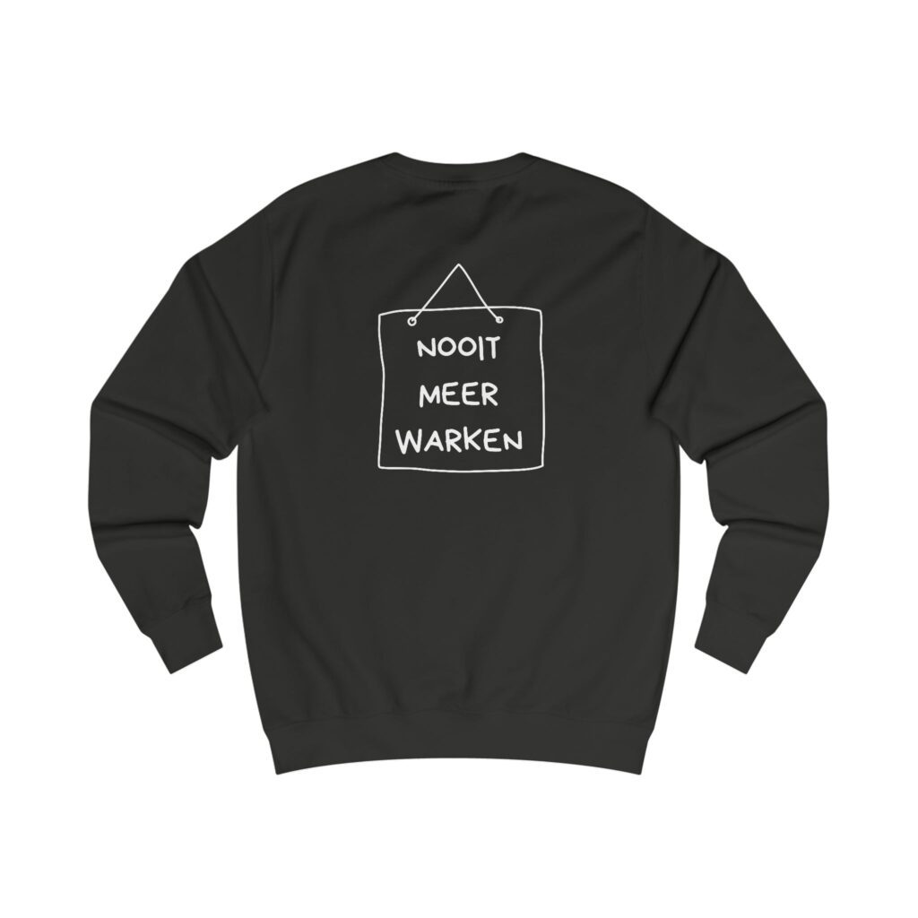 Mooi kedo veur een neie levensfase: dizze comfortabele trui met op de veurkaant de opdruk ‘klaor’ en op de achterkaant de tekst ‘nooit meer warken’.
