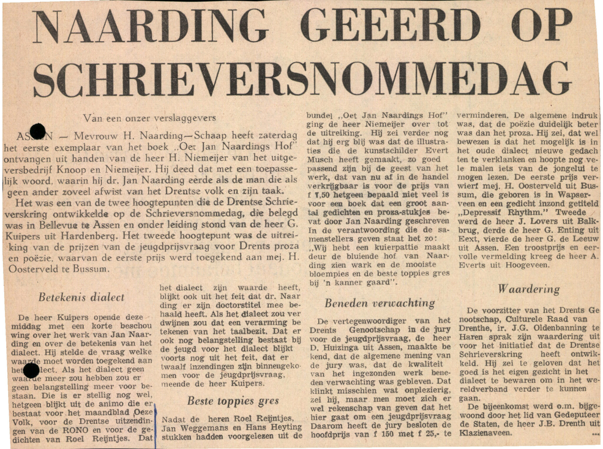 De Drentse Schrieverskring hef hum nao zien dood eerd met een bundel verzameld wark: Oet Jan Naardings hof. Een keur oet ’t wark van dr. Jan Naarding, bij ’n kanner gaard deur leden van de Drentse Schrieverskring (1969).